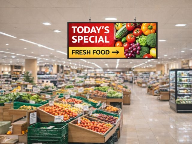 【店舗に必須な中型サイネージ➂】視界を遮らない空中広告、天吊りサイネージ
